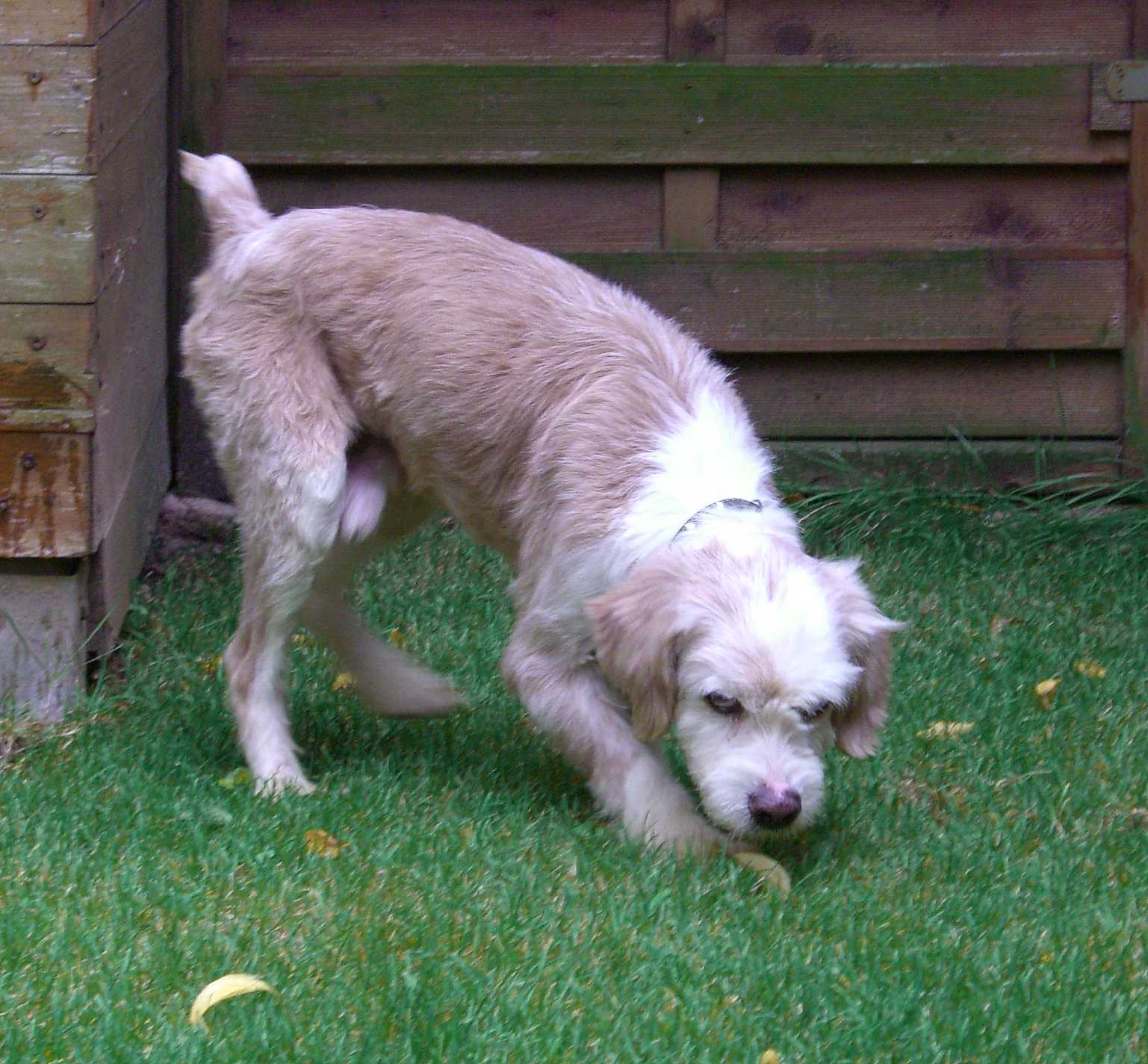 nicht in den Garten. Er hält unsere Gassigehzeiten gut ein. Muss er