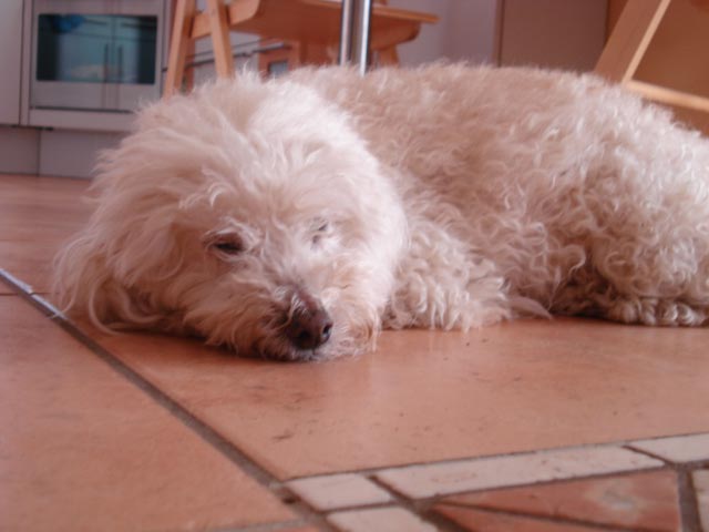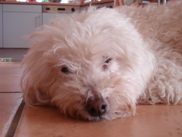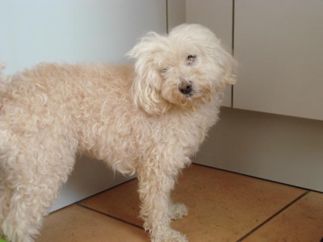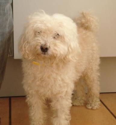 Mischlingshündin. Sie ist ein weißer Malteser-Pudelmix mit einem