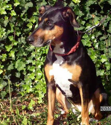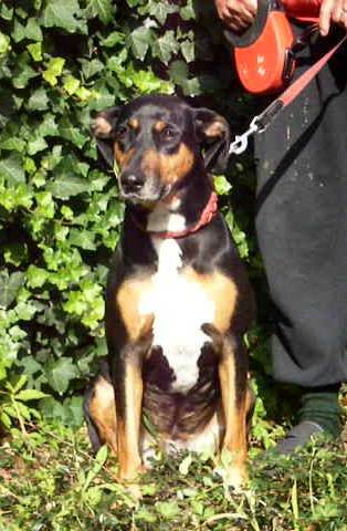 griechischer Mischlingshund in den Farben Schwarz-Braun-Weiß und kurzhaarig.