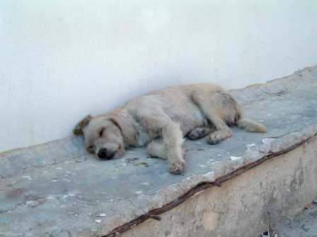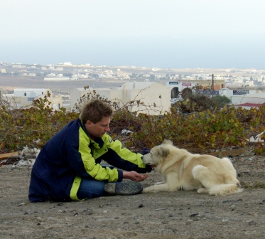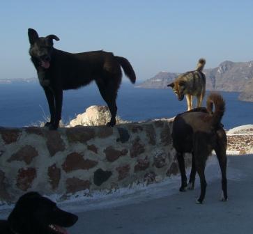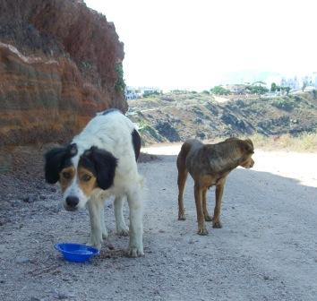 Für die Straßenhunde auf Santorini sind die Überlebenschancen gerade auch in Thira schlecht. Hier werden sie kaum geduldet, immer weg gescheucht und man legt gezielt Gift aus. Und ihren Wanderweg an der Caldera entlang nach Oia bevölkern zahlreiche Hobbyjäger. Das ganze Gelände dort ist übersät mit leeren Patronenhülsen aus deren Schotflinten. Viele Hunde lassen hier ihr Leben, weil sie verzweifelt von einem Ort zum anderen ziehen, um Nahrung zu suchen.