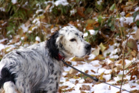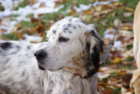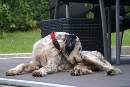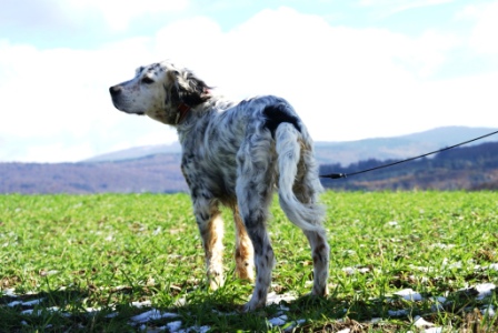 Setter mit schwarzen und braunen Flecken. Er hat ein ruhiges