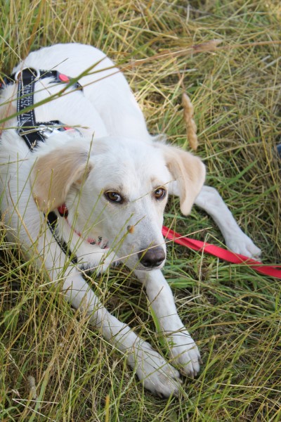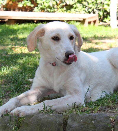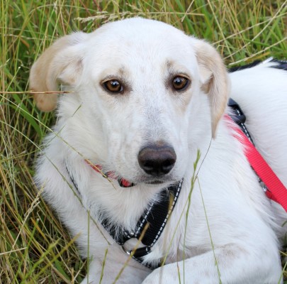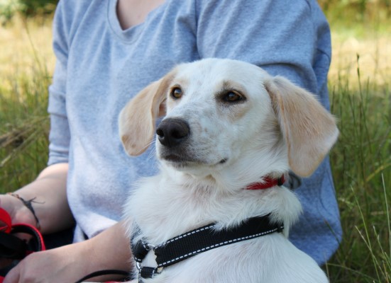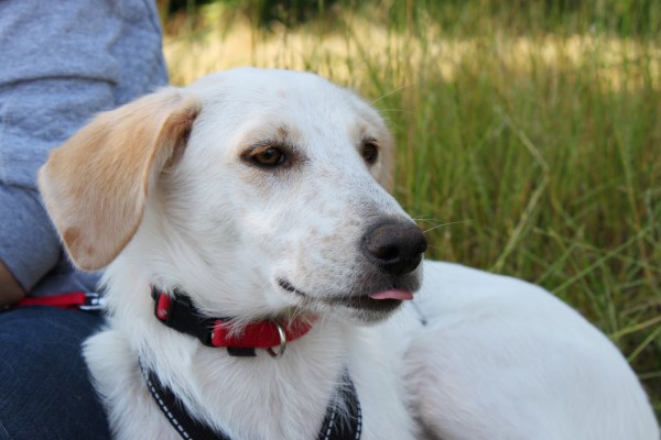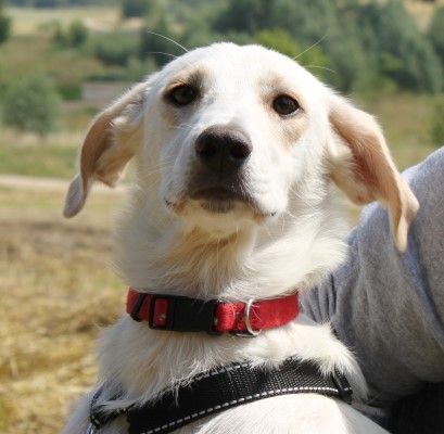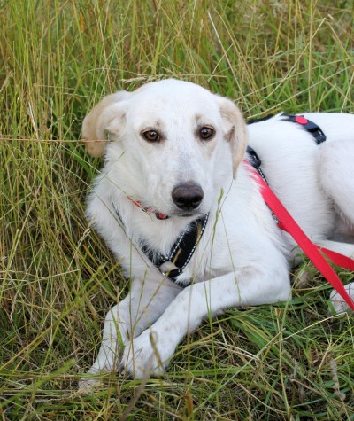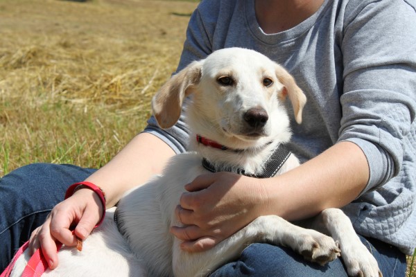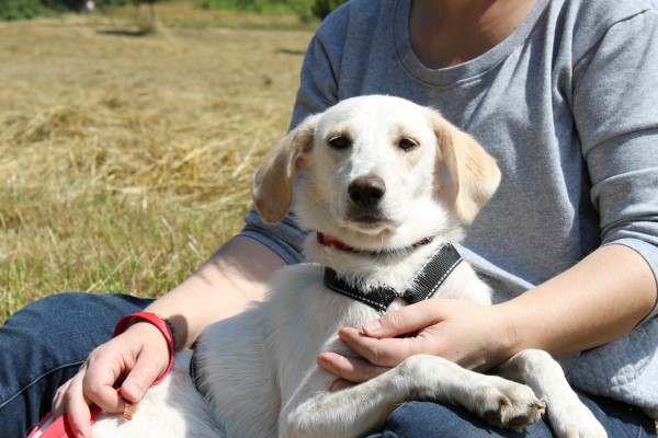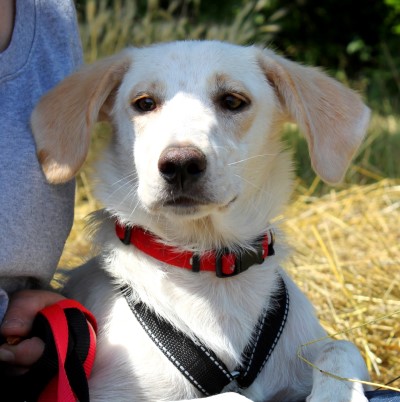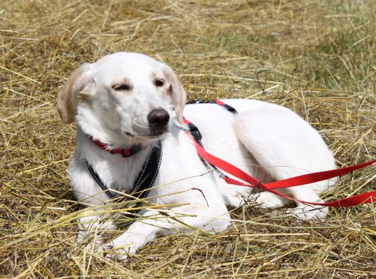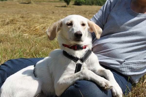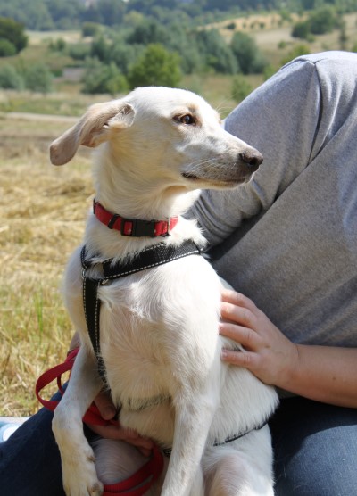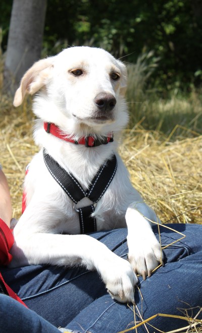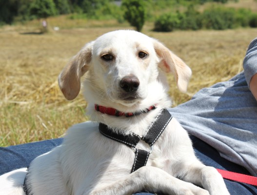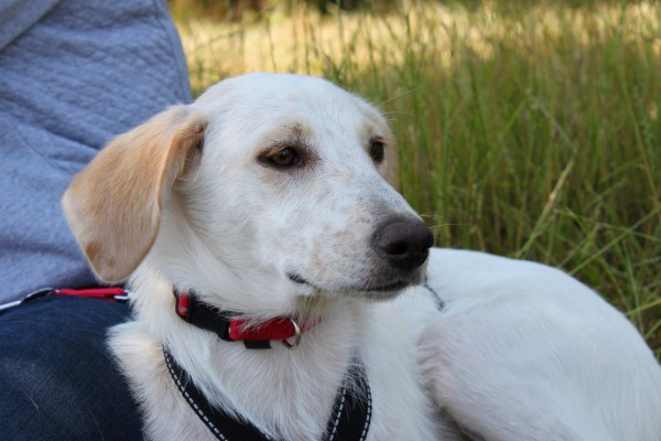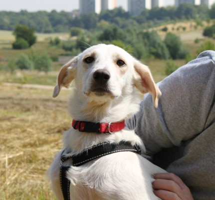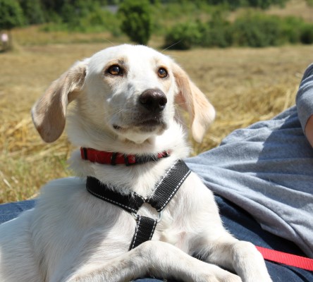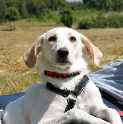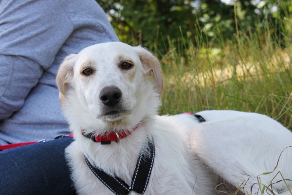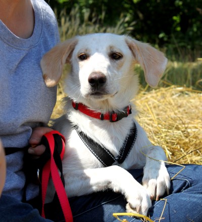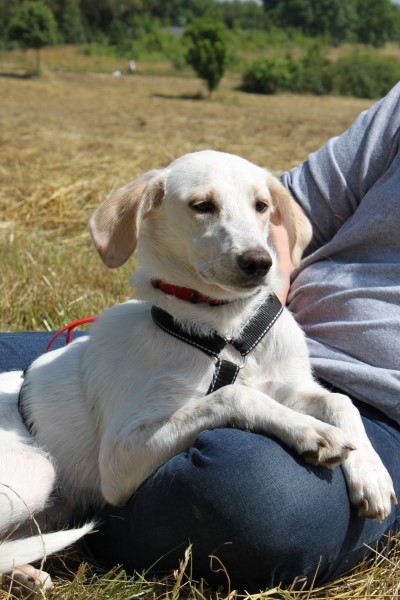 stets sanft und gutmütig, hat aber vor fremden Hunde erstmal Angst.
