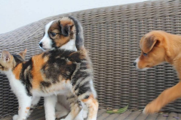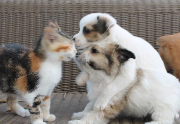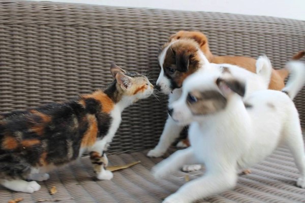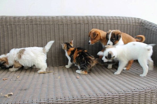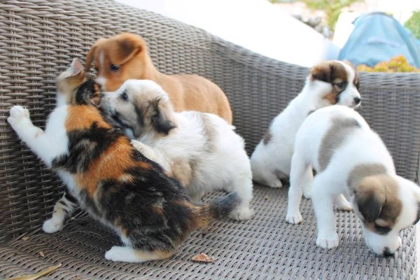 Katzenwelpen, kennen Papageien, große und kleine erwachsene Hunde