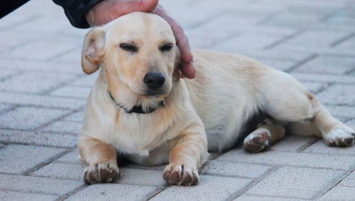 Straßenhündin, die letzten Sommer auf Santorini lebte und
