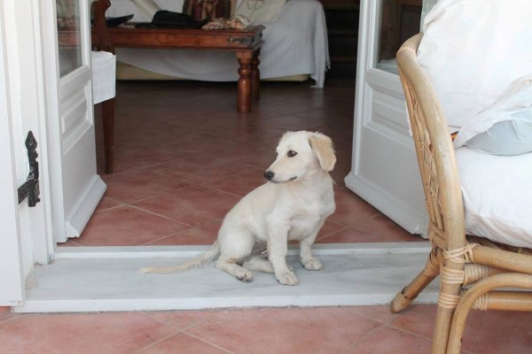 südländische junge Mischlingshunde. Es sind Geschwister, die auf Santorini