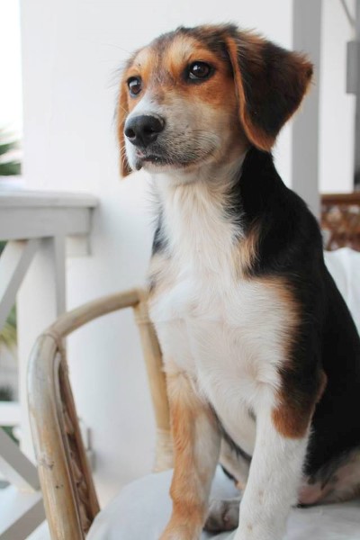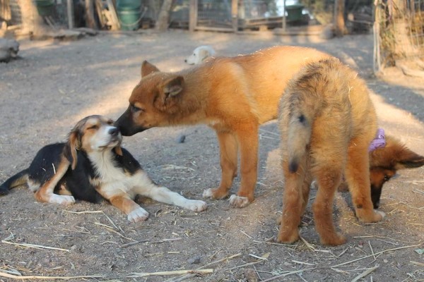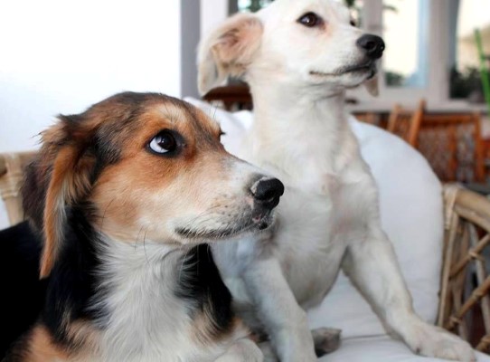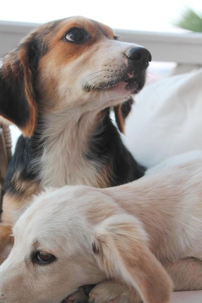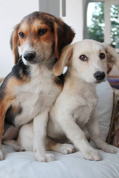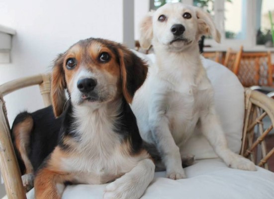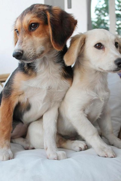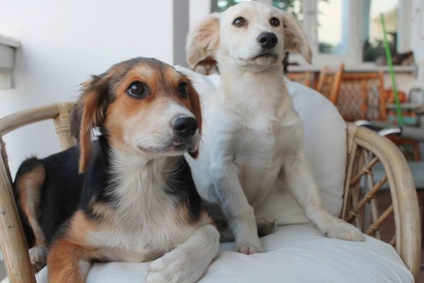 südländische junge Mischlingshunde. Es sind Geschwister, die auf Santorini