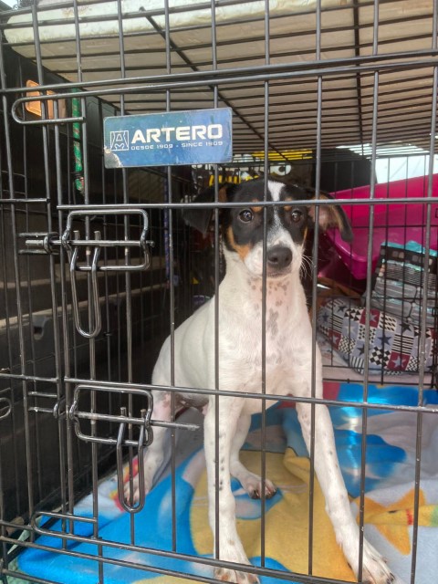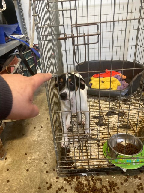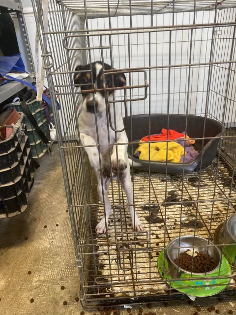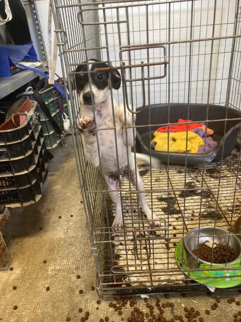 traurig in einer der kleinen Gitterboxen, die sogar am Boden