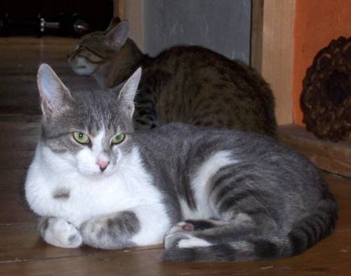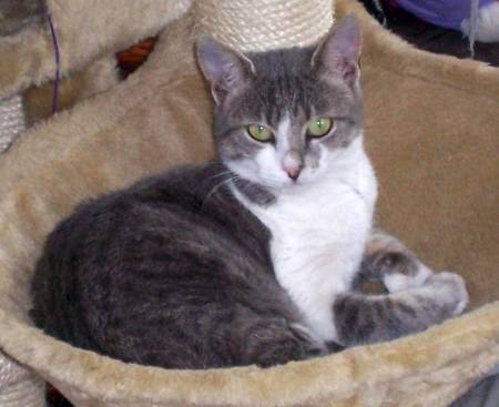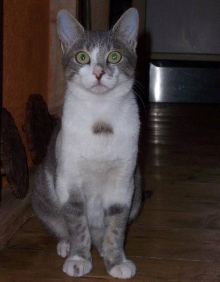 Er hat schönes silbergrau getigertes Fell mit weißem Latz und