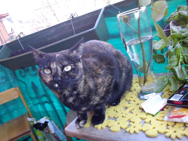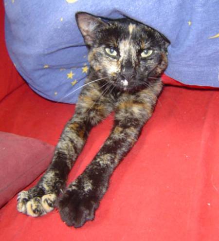 quirlige Schildpattkatze mit dem immer aufrecht geringelten Schwanz