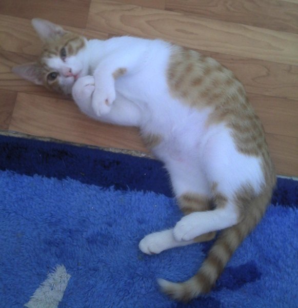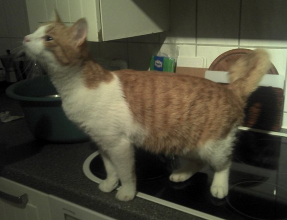 alte Katze mit weißem Bauch. Sie ist verspielt, sehr anhänglich und