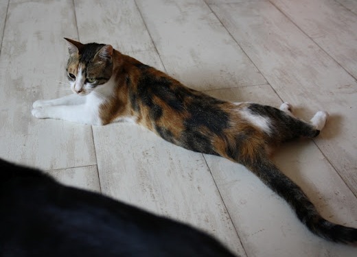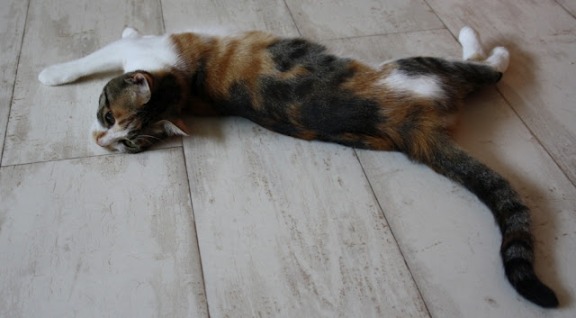 die Beine schmust und sich auf den Rücken schmeißt, damit man ihr
