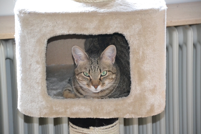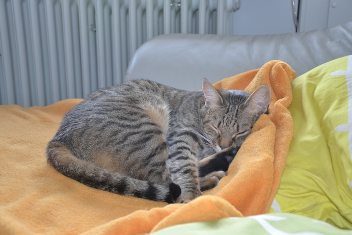 seiner aktuellen Katzenmama zu kuscheln. Außerdem hat er Papier zum