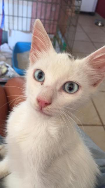 Der hübsche weiße Langhaarmix Kater mit den eisblauen Augen wurde