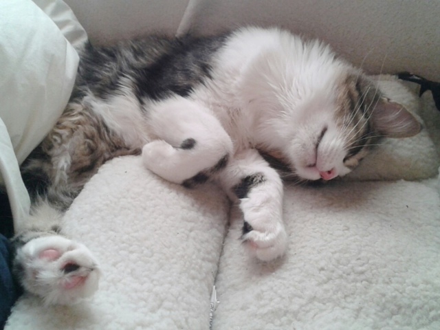 dem Sofa auf dem Rücken, streckt alle Viere von sich, schnurrt und