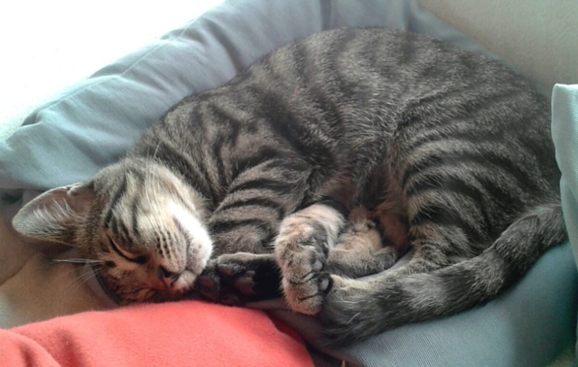 dem Sofa auf dem Rücken, streckt alle Viere von sich, schnurrt und