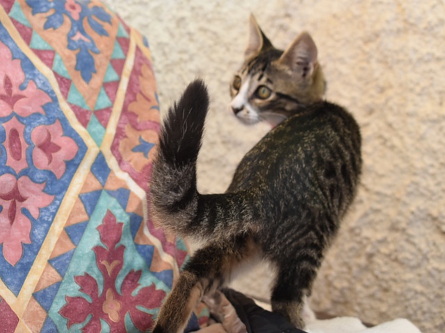 ein kleines Kätzchen ging, das in Kamari zwischen den Geschäften und