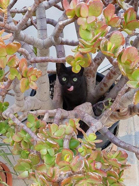 mit ihren großen grünen Kulleraugen an und will gestreichelt werden.