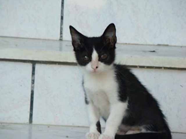 mit schlimmem Katzenschnupfen und kaputten Augen im Garten einer