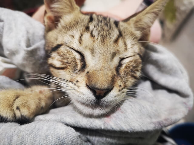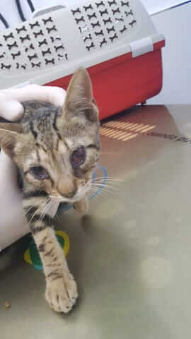 offensichtlich krankes Kätzchen. Man konnte seine Augen nicht sehen,
