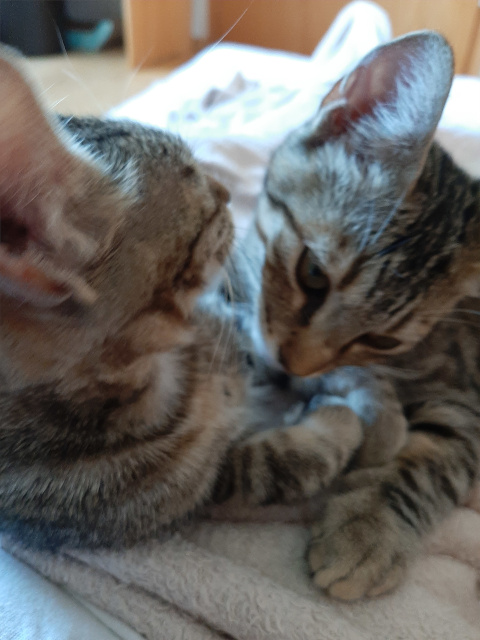 seiner Vorderpfote vorsichtig das Gesicht berührt – so, als wollte