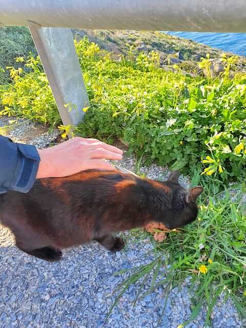 Leuchtturm auf Santorini mit hocherhobenem Schwanz und laut mauzend