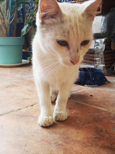 Whitty ist eine kleine schneeweiße Katze, die ständig in Begleitung