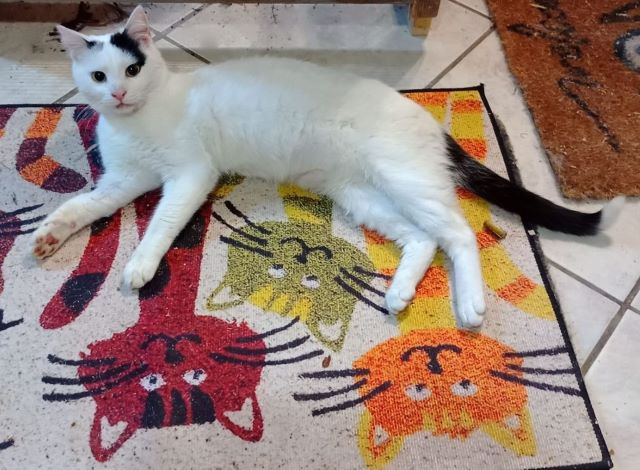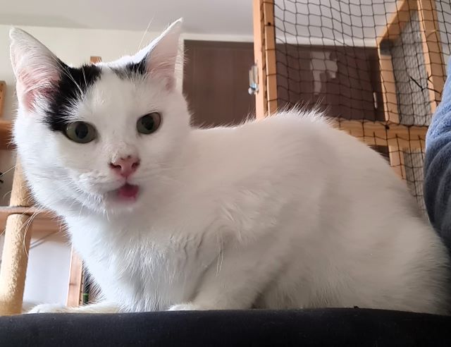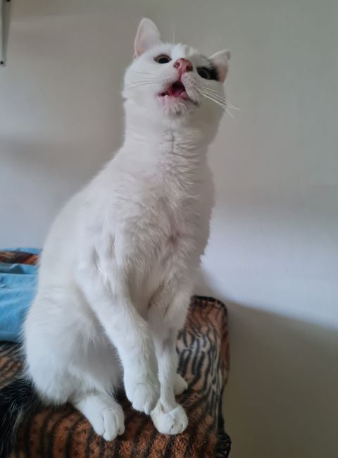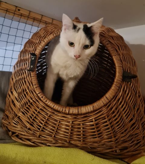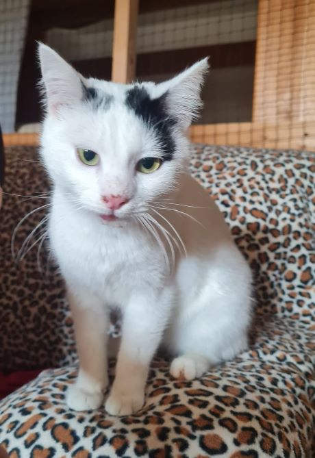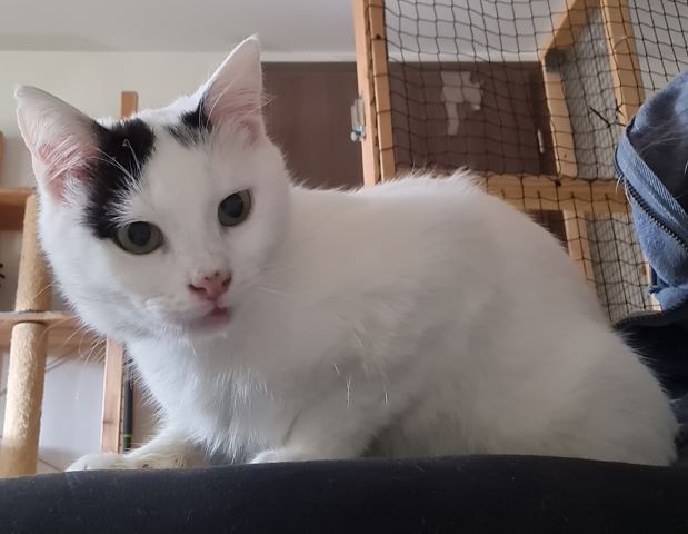 Holly, die hübsche weiße Katze mit den schwarzen Tupfen, ist eine