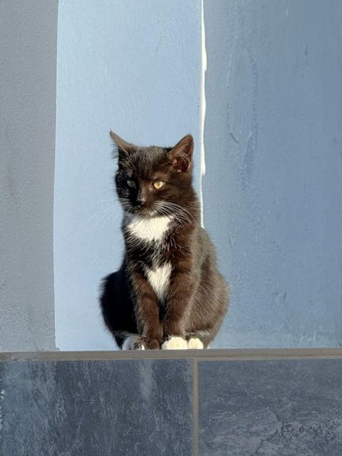 Es stellte sich heraus, dass das Hotel nicht nur direkt an der viel befahrenen Hauptstraße nach Oia liegt, sondern auch, dass die vier Samtpfoten dort mutterseelenallein zurückgeblieben waren. Das Hotel hatte vor einigen Tagen geschlossen und inzwischen war auch der Hausverwalter abgereist. Also kaum Chancen für die Kätzchen, den Winter zu überleben……