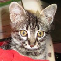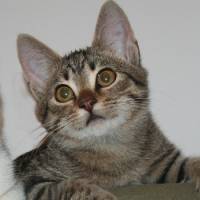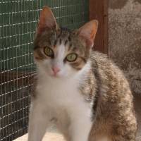 Katzenmädchen aus Kreta. Ich bin ca. 6 Monate alt, getigert mit weißen Pfötchen