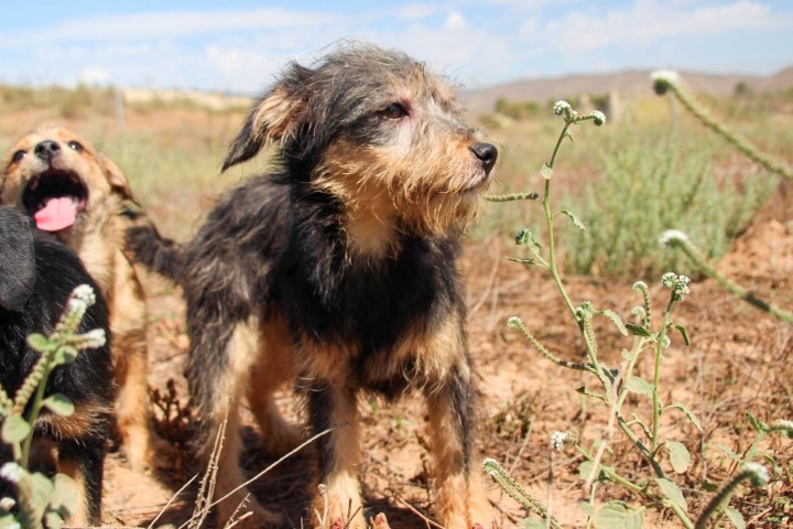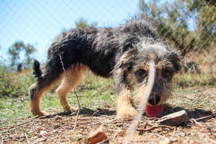 in der Perrera von Almeria traurig und verängstigt in ihrer Gitterbox.